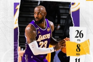 本场比赛,湖人球星詹姆斯上场32分钟,17投11中得到26分8篮板11助攻2抢断1盖帽。