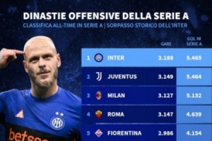 意甲历史进球榜:国米&尤文遥遥领先,米兰、罗马、佛罗伦萨前五